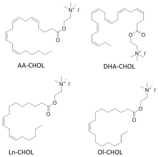 Dimethylaminoethanol esters of arachidonic (AA-DMAE), docosahexaenoic (DHA-DMAE), linoleic (Ln-DMAE), and oleic (Ol-DMAE) acids were obtained by the treatment of corresponding fatty acid chloride with β-N,N-dimethylaminoethanol as described in []. AA-CHOL, DHA-CHOL, Ol-CHOL, and Ln-CHOL were synthesized by treatment and AA-DMAE, DHA-DMAE, Ol-DMAE, and Ln-DMAE with methyl iodide as described in []. The compound purities were 95% to 97%.