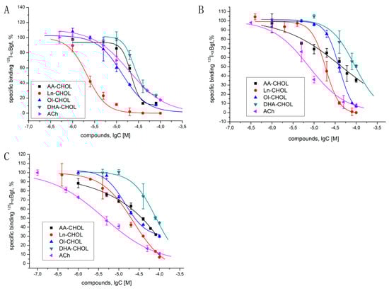 The results of 125I-αBgt competition assay for acylcholines. The IC50 values presented (95% CIs). In the ANOVA with Holm–Sidak post-test, the differences between all acylcholines on human a7 nAChR were significant with p < 0.05 except for the pairs Ln-CHOL vs. Ol-CHOL and Ol-CHOL vs. ACh; on T. californica nAChR, the differences between all acylcholines on human a7 nAChR were significant with p < 0.05 except for the AA-CHOL and Ol-CHOL pair; on AChBP, only differences in pairs AA-CHOL vs. Ln-CHOL, Ln-CHOL vs. Ol-CHOL, Ln-CHOL vs. DHA-CHOL, Ln-CHOL vs. ACh, and Ol-CHOL vs. DHA-CHOL were significant with p < 0.05.