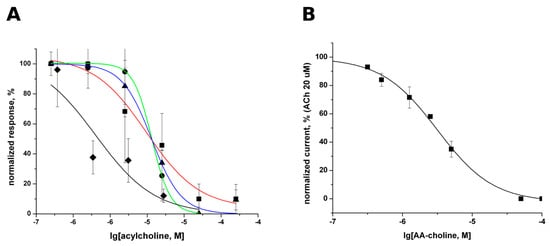 Using a radioligand assay, we studied acylcholines for their ability to compete with 125I-αBgt binding to the orthosteric sites of the nAChRs. At first, we tested the binding of acylcholines with the L. stagnalis AChBPs, which is the model for the ligand-binding domains of the whole family of Cys-loop receptors [,,]. Ln-CHOL was the most active (IC50 2.3 µM) (Figure 2A, Table 1), whereas all three other compounds, as well as ACh, demonstrated activities only at five- to ten-fold higher concentrations (IC50~13 to 20 μM).