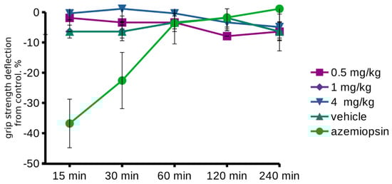 The observation of muscle nAChR inhibition by AA-CHOL with micromolar affinity led us to the hypothesis that acylcholines acts as muscle relaxants at high doses. A possible muscle relaxant effect of the AA-CHOL was studied by measuring the mouse front legs strength at test points of 15 min, 30 min, 1 h, 2 h, and 4 h, according to the protocol we previously used for azemiopsin, a peptide inhibitor of the muscle nAChR []. AA-CHOL was injected into the front paws in a volume of 20 μL for each paw in doses of 0.5, 1, and 4 mg/kg. The test group showed no differences from the control group (vehicle injection). We also tested AA-CHOL at higher doses using the subcutaneous injection of 10 and 30 mg/kg. No differences with the respective controls (vehicle) were found (Figure 4).