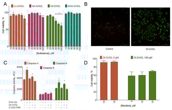 A549 lung cancer cell line viability inhibition by acylcholines. The cells were incubated with the substances for 24 h. Cell viability was determined using an MTT test. (A) the cytotoxicity of acylcholines. In the ANOVA with the Tukey post-hoc test, the survival of the cells at the Ol-CHOL concentration 100 μM differed statistically significant from other acylcholines with p < 0.05. Mean ± standard deviation, N = 3 experiments; (B) Apoptosis induction by 150 μM of Ol-CHOL, green phosphatidylserine sensor fluorescence, red membrane-impermeable nucleus stain 7-AAD, fluorescence microscopy, scale bar is 100 μm; (C) Caspase activation after 5 h incubation with either 100 μM of N-docosahexaenoyl dopamine (DHA-DA, positive control) or 150 μM of Ol-CHOL with or without 100 μM of the pan-caspase inhibitor Z-VAD-FMK, fluorescence of hydrolyzed specific substrates Ac-DEVD-AFC (Caspase 3), Ac-LEHD-AFC (Caspase 9), and SCP0139 (Caspase 8). Mean ± standard deviation, N = 3 experiments. *, a statistically significant difference from the untreated control; (D) the cytotoxicity of Ol-CHOL in the presence of nicotine. Mean ± standard deviation, N = 3 experiments.