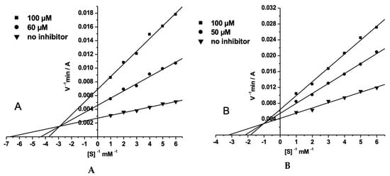 Lineweaver–Burk plots for steady state inhibition of AChE (A) and BChE (B) by AA-CHOL.