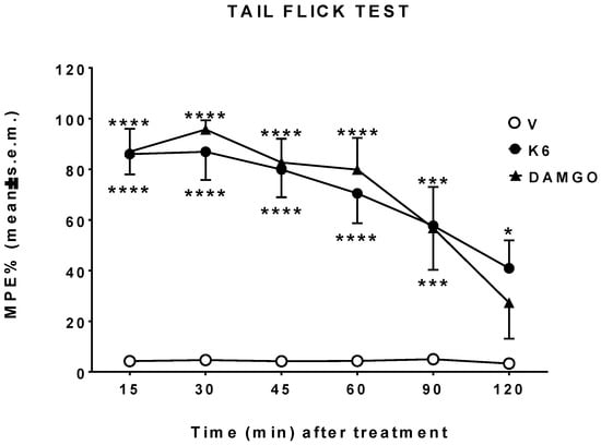 The effect of K6 and DAMGO in the tail flick test. Compounds were administered in the left cerebral ventricle at the dose of 10 μg/10 μL, and the time to respond to thermal stimuli measured from 15 to 120 min. V is for vehicle-treated animals. Statistical analysis: two-way ANOVA followed by Sidak’s multiple comparisons test. * is for p < 0.05, *** is for p < 0.001, and **** is for p < 0.0001 vs. V. n = 7.