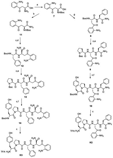 Synthesis of peptides K2, K3. Reagents and conditions: (a) Boc2O, NaHCO3, NaOH 1 M, dioxane/H2O (2:1), 10 min at 0 °C, then 30 min at r.t. quantitative; (b) iBCF, NMM, NH4OH, THF, 30 min at −10 °C, then 16 h at r.t., 71% yield after trituration; (c) TFA/DCM 1:1, 1 h at r.t. quantitative; (d) Boc-Phe-OH, EDC.HCl, HOBt, DIPEA, DMF, 10 min at 0 °C, then 16 h at r.t. quantitative; (e) Boc-Pro-OH, EDC·HCl, HOBt, DIPEA, DMF, 10 min at 0 °C, 16 h at r.t., 72% yield for 13 after trituration, 81% yield for 9; (f) Boc-Tyr-OH, EDC·HCl, HOBt, DIPEA, DMF, 10 min at 0 °C, 16 h at r.t., 95% yield for 14 after trituration, 73% yield for 10; (g) H-Phe-NH2, EDC·HCl, HOBt, DIPEA, DMF, 10 min at 0 °C, then 16 h at r.t., 61% yield from 7 after trituration.