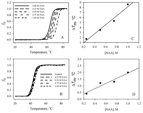 Thermal denaturation profiles of lysozyme at pH 7.0 and pH 2.5. Left panels: Denaturation curves of lysozyme at pH 7.0 (A) and at pH 2.5 (B) in the absence and presence of various NAA concentrations. Right panels: Plots of ∆Tm versus NAA of lysozyme at pH 7.0 (C) and at pH 2.5 (D).The protein concentration used was 58 µM.