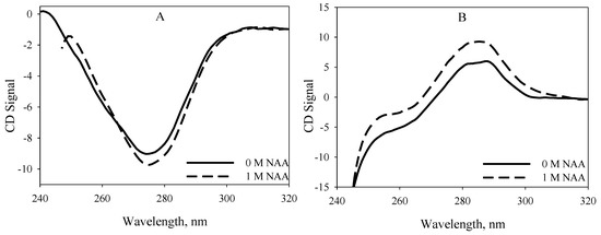 Effect of NAA on the tertiary structure of native proteins at 25 °C. Near-UV CD spectra of the native states of RNase-A (A) and lysozyme (B) in the absence and presence of NAA at pH 7.0.