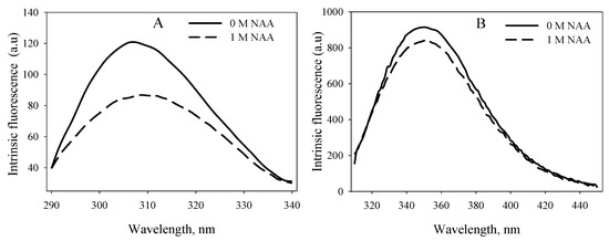 Effect of NAA on the intrinsic fluorescence of native proteins at 25 °C.Tyrosine fluorescence spectra of RNase-A (A) and tryptophan fluorescence spectra of lysozyme (B) in the absence and presence of NAA at pH 7.0.The protein concentration used was 3 µM.