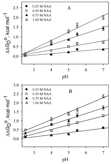 We were further interested in investigating the pH-dependent behavior of protein stabilization by NAA. As shown in Table 1, the stabilizing effect of NAA on the protein is higher at pH 7.0, but is highly reduced at the lowest pH values. To further confirm the pH dependence of the effect of NAA on protein stability, we have plotted ∆∆GD° (∆GD° of protein in the presence of NAA—∆GD° of protein in the absence of NAA) as a function of pH (see Figure 5). It was observed in the figure that the dependence of ∆∆GD° on pH is linear at each NAA concentration. The results indicate that the interaction of the NAA with the protein might be different at different pH values.