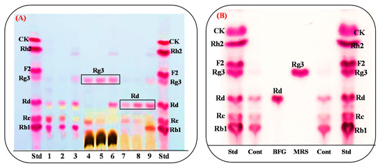 (A) Thin-layer chromatography (TLC) analysis showed the conversion of the PPD-mix extracts by Lactobacillus ginsenosidimutans EMML 3041T from Korean ginseng, American leaf saponins, and Chinese ginseng. Std, ginsenosides standards; 1. Korean ginseng extract (KGE) control; 2, American leaf extract (ALE) control; 3, Chinese ginseng extract (CGE) control; 4–6, conversion of KGE, ALE, and CGE in MRS broth; 7–9, conversion of KGE, ALE, and CGE in Basel Food-Grade broth. (B) The effect of two different media (MRS and BFG) on the bioconversion of PPD-mix-type ginsenosides. Std, ginsenoside standard; cont, control of PPD-mix ginsenosides (Rb1, Rc, and Rd).