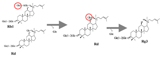 - Quan, L.H.; Min, J.W.; Yang, D.U.; Kim, Y.J.; Yang, D.C. Enzymatic biotransformation of ginsenoside Rb1 to 20(S)-Rg3 by recombinant bglucosidase from Microbacterium esteraromaticum. Appl. Micro Biotech. 2012, 94, 377–384. [Google Scholar] [CrossRef] [PubMed]