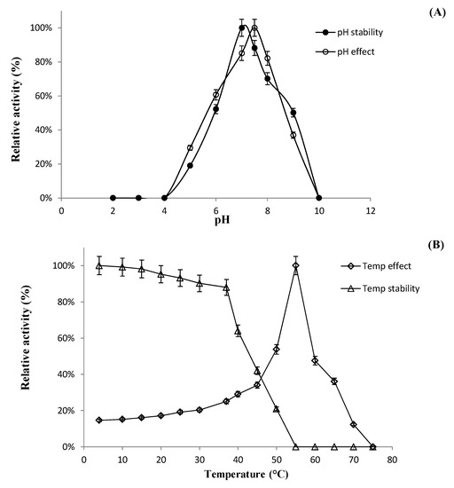 (A). Effect of pH on enzyme activity. Enzyme activity was measured under standard assay conditions. Enzyme solutions containing 2.0 mM pNPGlc were incubated with various buffers at pH 2.0–10.0 for 12 h at 4 °C. To assess the stability of BglAg-762, the enzymes were incubated for 30 min at 50 °C in various buffers at pH 2.0–10.0, and the residual activities were measured. (B) The effect of temperature on the stability and activity of recombinant BglAg-762 was measured under standard assay conditions. The thermodependence of BglAg-762 was assayed using 50 mM potassium phosphate buffer (pH 7.5) at varying temperatures ranging from 4–60 °C. Thermostability was tested by incubating aliquots of the enzyme in 50 mM potassium phosphate buffer (pH 7.5) for different periods of time at various temperatures. After cooling the sample, the residual activity was determined.