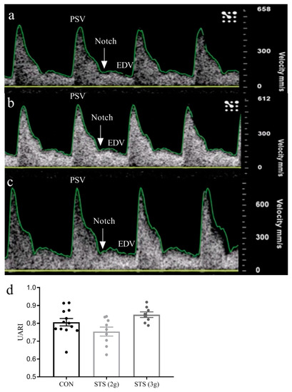 The UARI in healthy Sprague-Dawley rats is 0.55 ± 0.02 at the end of pregnancy [20]. In this study we, again, observed elevated UARI with characteristic notching in the ultrasound waveforms in the Dahl S dams (Figure 1a–c). Although there was a treatment effect across the groups (p = 0.03), UARI was not different when treatments with 2 g and 3 g STS per kg body weight per day were compared with the control (respectively, p = 0.15 and p = 0.31, Figure 1d).