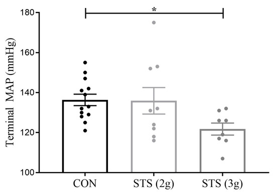 During late pregnancy, Sprague-Dawley rats had a MAP of 97 ± 6 mmHg [24] with a heart rate of 326 ± 15 [unpublished data] when measured under anesthesia. Terminal MAP (under anesthesia) was not different between pregnant Dahl rats treated with 2 g STS per kg body weight per day and the control (135.9 ± 6.6 vs. 136.3 ± 2.9 mmHg, p = 0.99, Figure 2). In contrast, Dahl S rats treated with 3 g STS per kg body weight per day, demonstrated a significant decrease in terminal MAP as compared with the control group (121.8 ± 3.0 vs. 136.3 ± 2.9 mmHg, p < 0.05, Figure 2). Heart rate was also decreased in a dose-dependent manner following STS treatment, CON (n = 10) 359 ± 7 bpm versus STS 2 g (n = 7) 333 ± 9 bpm versus STS 3 g (n = 8) 321 ± 8 bpm (p = 0.006, Dunnett’s multiple comparison CON vs. STS 2 g p = 0.07 and CON vs. 8 STS 3 g p = 0.004).