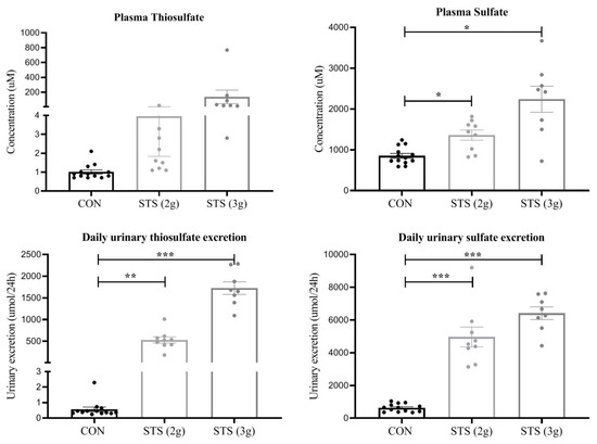 Plasma concentration and daily urinary excretion of thiosulfate and sulfate in the Dahl S rat treated with STS versus a control. Plasma concentrations and urinary excretion between the control dams (n = 13) and treated dams dosed at 2 g STS per kg body weight per day (n = 9) or 3 g STS per kg body weight per day (n = 8) were tested with Brown–Forsythe and Welch ANOVA and Dunnett’s multiple comparison test. CON, control; STS, sodium thiosulfate; 2 g, 2 g per kg body weight per day; and 3 g, 3 g per kg body weight per day. Data presented as mean ± S.E.M. * p < 0.01; ** p < 0.001; *** p < 0.0001.