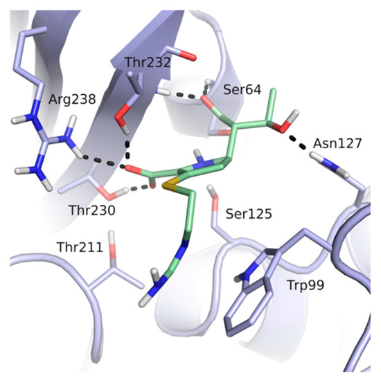 Thirteen crystal structures of GES-type BLs are now available, making it an attractive target for the structure-based design of novel molecules able to counteract antibiotic resistance mediated by these enzymes [12,13,14,15,16,17,18]. However, compared to other carbapenemases, the number of available GES-type BL crystal structures is still quite limited, reflecting the low level of attention so far dedicated to the GES family. For GES-5, the target of our study, five crystal structures of the wild-type or mutant enzyme have been deposited in the Protein Data Bank (PDB) [12,13,14]. Two of them are binary complexes with either the substrate imipenem or a boronic acid inhibitor. A characteristic feature of BL binding sites is the oxyanion hole, which is typically addressed by negatively charged groups. In the case of GES-5, the oxyanion hole is formed by the amino acids Ser125, Thr211, Thr230 and Thr232 (Figure 1).