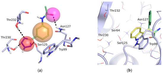 A pharmacophore for GES-5 inhibitors was derived in an analogous way as done previously for KPC-2 [21]. The structure comparison of GES-5 and KPC-2 was performed using the Molecular Operating Environment (MOE; Chemical Computing Group, Montreal, QC, Canada) and PyMOL (Schrödinger, LLC, New York, NY, USA). The published structures of GES-5 (PDB code 4GNU and 4H8R) and our in-house structure were aligned with the structure of KPC-2 (PDB code 3RXW) to identify key interactions. The final pharmacophore was based on the apo-crystal structure of GES-5, which we have solved for this project (PDB code 6TS9), and the ligand 0JB of CTX-M-9 β-lactamase (PDB code 4DE0). It contained the same features as our previous pharmacophore for KPC-2, namely a hydrogen-bond acceptor feature for interactions with Ser125, Thr230 and Thr232, a hydrophobic π-stacking feature with Trp99 and a hydrogen bond acceptor feature for interaction with Asn127 (Figure 2a). The interactions to Thr230 and Thr232 were set as mandatory for filtering the obtained docking hit list.