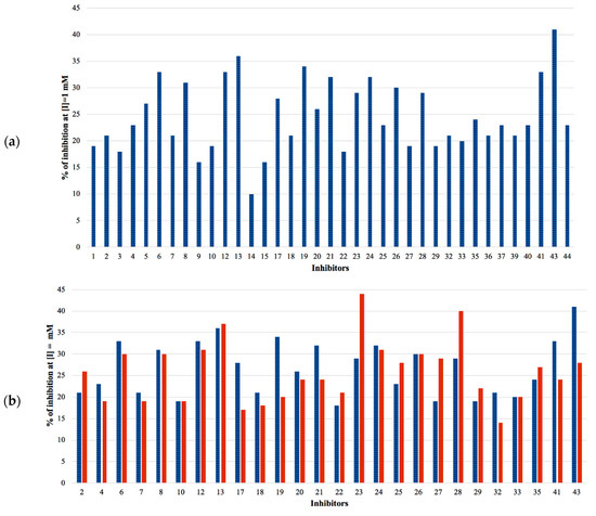 (a) Percentage inhibition against GES-5 at 1 mM inhibitor concentration. (b) Percentage inhibition at 1 mM inhibitor concentration against GES-5 (blue) and KPC-2 (red).