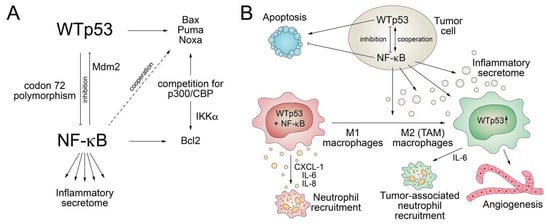 However, in other settings, p53 cooperates with NF-κB. For example, induction of apoptosis by p53 was shown to require activation of NF-κB, possibly because p53-mediated transactivation of the pro-apoptotic target genes Noxa and p53AIP1 is dependent on NF-κB [97,98]. In normal macrophages, p53 and NF-kB co-activation results in induction of pro-inflammatory cytokines and chemokines like CXCL-1, IL-6, and IL-8, resulting in neutrophil recruitment and inflammation [99]. In tumor-conditioned macrophages as a model for tumor-associated macrophages (TAMs), p53 is constitutively activated in response to paracrine signals from tumor cells and facilitates secretion of IL-6, which has well-documented pro-tumor effects by promoting tumor cell survival, angiogenesis, and recruitment of tumor-associated neutrophils (TAN) [99]. Interestingly, the cooperative transactivation of inflammatory target genes by p53 and NF-κB is modified by a common TP53 polymorphism at codon 72, as the P72 variant interacts better with the p65 RelA subunit of NF-κB than the more prevalent R72 variant [100]. P72 knock-in mice therefore show an enhanced response to inflammatory challenge [100].