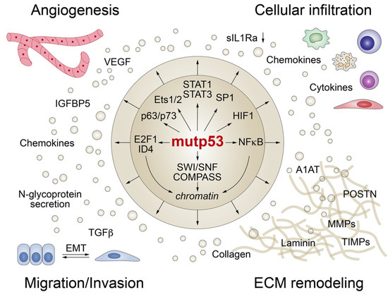 Mutant p53 shapes the tumor cell secretome at the transcriptional level. Mutant p53 interacts with transcription factors and/or chromatin-modifying enzymes (SWI/SNF and COMPASS) to promote angiogenesis, trigger epithelial-mesenchymal transition (EMT), remodel the extracellular matrix (ECM), and modulate the composition and function of the cellular stroma infiltrate.