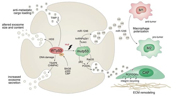 Mutant p53 shapes the tumor cell secretome at the exosome level. TP53 mutations abrogate wild-type p53-mediated effects on exosome secretion, size, and cargo and actively control exosomal secretion of miR-1246 and podocalyxin (PODXL), thereby affecting macrophage M1-M2 polarization and extracellular matrix (ECM) remodeling by cancer-associated fibroblasts (CAF).