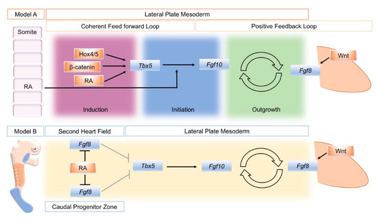 A model that attempts to unify data from several sources divides the establishment of the limb bud into three phases: induction, initiation, and outgrowth. Initially, a coherent feed-forward loop [41] is set-up through the action of RA and Tbx genes. Then, a positive feedback loop of FGF signaling between the lateral plate mesoderm and the overlying, distal ectoderm is established that sustains limb bud outgrowth (Figure 1, Model A) [24]. During the induction phase, Raldh2 expression in axial tissue produces RA locally that acts on adjacent lateral plate mesoderm in combination with intrinsically expressed ß-catenin and 3’ Hox genes to activate Tbx5 expression. In a coherent feed-forward loop, RA and Tbx5 together induce Fgf10 expression. Fgf10 produced in the limb mesenchyme (with input from Wnt signaling) subsequently induces Fgf8 in the overlying ectoderm. This establishes the Fgf10–Fgf8 positive feedback loop that drives limb bud outgrowth.