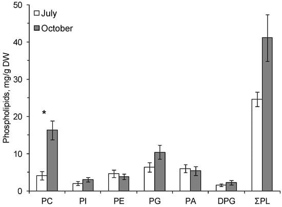 Figure 1. The contents (mg/g dry weight, standard error) of total phospholipids (ƩPL), phosphatidylcholine—PC, phosphatidylinositol—PI, phosphatidylethanolamine—PE, phosphatidylglycerol—PG, phosphatidic acid—PA and diphosphatidylglycerol—DPG in the leaves of Avena sativa on 25.07.2014 (July) and 3.10.2014 (October). *—Significant differences according to Student’s t-test.