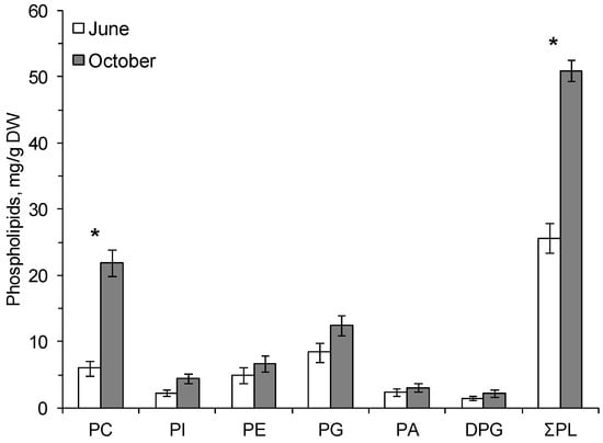 Figure 2. The contents (mg/g dry weight, standard error) of total phospholipids (ƩPL), phosphatidylcholine—PC, phosphatidylinositol—PI, phosphatidylethanolamine—PE, phosphatidylglycerol—PG, phosphatidic acid—PA and diphosphatidylglycerol—DPG in the leaves of Bromopsis inermis on 16.06.2014 (June) and 3.10.2014 (October). *—Significant differences according to Student’s t-test.
