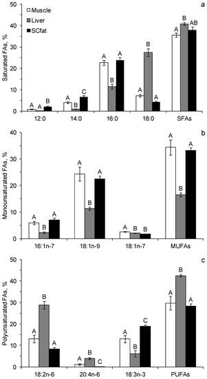 Figure 3. Contents of the prominent saturated fatty acids (a), monounsaturated fatty acids (b) and polyunsaturated fatty acids (c) (% of total FAs, standard error) in liver, muscle and subcutaneous adipose tissues of the Yakutian horses. Means for the same FAs labeled with the same letters are not significantly different at p < 0.05 after Tukey’s HSD post hoc test.