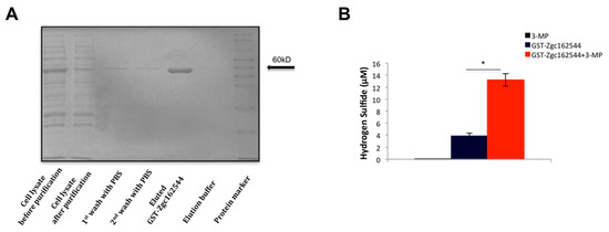 Purification and enzymatic activity of recombinant GST-Zgc162544. (A) Representative SDS-PAGE of all fractions collected after different purification steps of GST-Zgc162544. (B) H2S production by GST-Zgc162544 in the presence of 3-MP. Data are presented as mean ± SEM; n = 6–7; * P < 0.05.