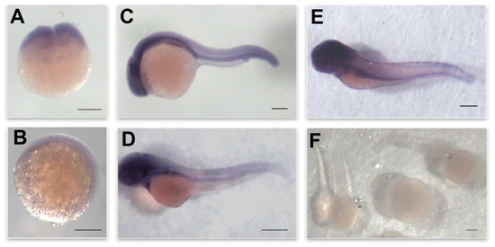 - Thisse, B.; Thisse, C. In Situ Hybridization on Whole-Mount Zebrafish Embryos and Young Larvae. Methods Mol. Biol. 2014, 211, 53–67. [Google Scholar]
