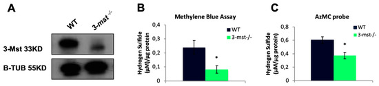 F1 founders, heterozygous (−/+) for the selected mutation, were next crossed to produce the F2 generation, to yield homozygous (−/−) zebrafish. F2 zebrafish with a −/− genotype were identified and mated. F3 3-mst−/− homozygous was used for all the following experiments (Supplementary Figure S2). The efficiency of the mutation at the protein level was next confirmed using Western blot analysis. 3-Mst protein could not be detected in 3-mst−/− zebrafish embryos, indicating that the mutation leads to no protein translation (Figure 4A). Subsequently, we assessed the H2S levels in WT and 3-mst−/− using two different methods. In line with the Western blot results, H2S levels were reduced in mutant embryos, providing proof for the genetic ablation of 3-Mst function (Figure 4B,C).