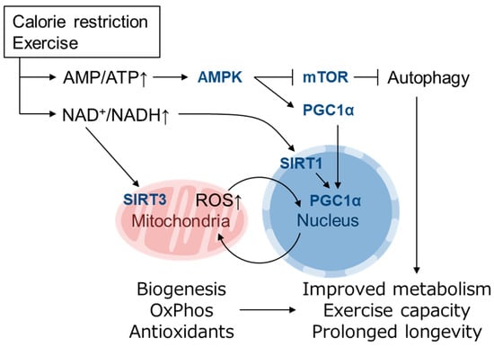Mitohormesis caused by mild metabolic stress elicits an antioxidant defense response. Metabolic stress, such as caloric restriction and exercise, causes a decline in ATP levels and an increase in the NAD+/NADH ratio that is sensed by downstream pathways that promote mitochondrial function and increase ATP synthesis [,]. An increase in AMP/ATP activates AMPK, which induces mitochondrial biogenesis via PGC1α activation and enhances autophagy via mTOR inhibition. An increase in NAD+/NADH activates the NAD+-dependent deacetylases SIRT1 and SIRT3 []. Mitochondrially localized SIRT3 activates enzymes involved in mitochondrial ATP synthesis, whereas nuclear SIRT1 also activates PGC1α [,]. PGC1α activates the expression of genes involved in mitochondrial biogenesis, fatty acid oxidation, oxidative phosphorylation (OxPhos) and the antioxidant defense system. These adaptations resolve energy shortages and improve metabolic health, exercise capacity and longevity [].