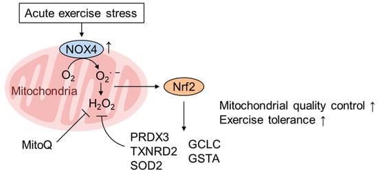 Acute exercise activates Nrf2 via NOX4 expression in the heart. Acute exercise stress (AES) stimulates cardiac performance and exercise capacity via the expression of genes involved in mitochondrial quality control (PRDX3, TXNRD2, and SOD2) as well as cytoplasmic ROS scavenging (GCLC, GSTA1/2) in a NOX4- and Nrf2-dependent manner [,]. NOX4 induced by AES localizes to various organelles, including the plasma membrane, nucleus, endoplasmic reticulum (ER), and especially mitochondria, in the heart and produces ROS to activate Nrf2 [,,]. The AES-induced decrease in mtROS is inhibited by Nrf2 deficiency but rescued by the mitochondria-targeted antioxidant MitoQ [].