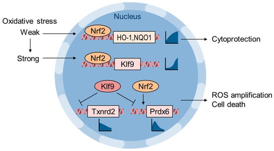 Zucker et al. showed that Klf9 is an Nrf2 target gene that is activated in response to lethal oxidative stress and paradoxically increases intracellular ROS via the repression of Txnrd2 [] (Figure 4). They showed that Nrf2 is recruited to the ARE of HO-1 and NQO1 genes in response to low-dose H2O2 or sulforaphane, whereas Nrf2 is recruited to the ARE of the Klf9 gene only when cells are exposed to high-dose H2O2 or sulforaphane. Klf9 overexpression increases basal intracellular ROS as well as H2O2-induced apoptosis, whereas Klf9 depletion reverses these effects. Txnrd2 overexpression reduces both basal ROS levels and H2O2-induced cell death in Klf9-expressing cells. Klf9-mediated oxidative stress was evaluated in vivo using bleomycin-induced pulmonary fibrosis model mice, and Klf9-KO mice exhibited a decrease in 8-OHdG levels and fibrosis []. Chhunchha et al. also reported an adverse effect of Klf9 in human lens epithelial cells treated with high-dose sulforaphane []. Low-dose sulforaphane induces peroxiredoxin-6 (Prdx6) gene expression via Nrf2 and ARE in its regulatory region; however, high-dose sulforaphane suppresses Prdx6 expression via Klf9 and the repressive Klf9 binding element (RKBE). These reports implicate Klf9 as a factor determining cell fate in response to the magnitude of oxidative stress, and Klf9 suppression/inhibition is a possible strategy to alleviate the side effects of Nrf2-activating interventions [] (Figure 4).