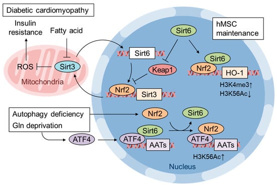 Regulation of gene expression by Nrf2 and Sirt6 crosstalk. Sirt6 expression restores Nrf2 and Sirt3 expression and improves diabetic cardiomyopathy. Sirt6 activates Nrf2 by repressing Keap1 expression as well as interfering with the Nrf2-Keap1 interaction []. Sirt6 expression is also important for hMSC maintenance and acts by enhancing Nrf2 target gene expression via epigenetic modifications, increased histone H3 Lys4 trimethylation and decreased Lys56 acetylation []. Glutamine starvation in autophagy-deficient cells induces the expression of amino acid transporters (ATTs) to replenish cellular amino acid shortages []. Nrf2 is recruited to the ATT gene enhancer by ATF4, where the replacement of Sirt6 with Nrf2 enhances H3K56 acetylation and AAT transcription [].