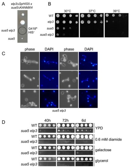 Synthetic phenotypes in the genetic background of sua5 elp3 mutants. (A) Tetrad analysis of a sua5::KANMX4/SUA5 elp3::SpHIS5/ELP3 diploid strain, generated by crossing BY4741 elp3::SpHIS5 and BY4742 sua5::KANMX4. The genotype of indicated spores was determined by phenotypic analysis (-HIS media, G418 media) and diagnostic PCR. G418R: Geneticin resistance; HIS+: Histidine prototrophy. (B) Serial dilution spot assay of indicated strains on YPD plates, which were incubated at 30 °C, 37 °C, or 39 °C for 48 h. (C) Elongated bud morphology and nuclear segregation defect of the sua5 elp3 strain. Cells were ethanol fixed and stained with DAPI before phase-contrast and fluorescence microscopy. (D) Serial dilution spot assay of indicated strains on YPD, YPD containing 0.6 mM diamide, yeast peptone galactose or yeast peptone glycerol medium. Plates were photographed after the indicated incubation times.