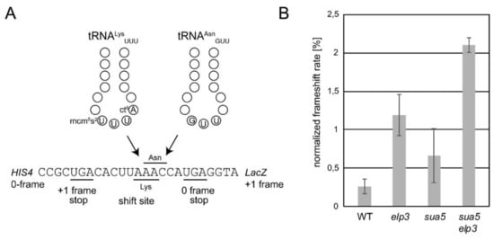 S. cerevisiae strains carrying a deletion in ELP3, which encodes the catalytic subunit of the Elongator complex, lack mcm5U in tRNA [28] while strains with deletions of SUA5 encoding the first enzyme of the t6A synthesis pathway, threonylcarbamoyl-AMP synthase, lack t6A [25]. To test whether elp3 and sua5 mutations are in fact synthetically lethal, we sporulated a heterozygous sua5 elp3 double mutant (Figure 2A). Spores containing both mutant alleles are able to germinate but form visible colonies only several days after the appearance of colonies from spores without the sua5 allele alone. Serial dilution growth assays indeed revealed a further enhanced growth defect of the sua5 elp3 strain as compared to the sua5 single mutant (Figure 2B). Microscopic analysis of cell shape and nuclei distribution revealed morphological defects and mis-segregated nuclei in the sua5 elp3 (Figure 2C). In addition, the obtained sua5 elp3 strain is unable to grow in the presence of various exogenous stressors such as elevated temperature, diamide, or alternative carbon sources (Figure 2B,D). As the presence of mcm5s2U in yeast tRNALysUUU suppressed +1 frameshift events, and t6A is also involved in reading frame maintenance [24,72], we analyzed a potential cumulative effect on +1 frameshift levels in the generated sua5 elp3 mutants. We utilized the previously described frameshift sequence in which a +1 ribosomal shift can be induced by weakened A-site binding of tRNALysUUU [72]. In both sua5 and elp3 single mutants, elevated +1 shift levels were observed, which further increase in the sua5 elp3 double mutant (Figure 3). Thus, mcm5s2U and t6A indeed independently contribute to reading frame maintenance.
