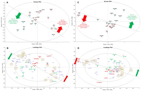 Parallel codon usage behavior was observed in the insoluble proteins in the sua5 mutant, with no apparent bias in the use of t6A-dependent ANN codons in up- and down-regulated proteins. As shown in the scores plot in Figure 5C, the 10 most significant up- and down-regulated proteins in the insoluble fraction are distinguished from each other, though not as clearly as the soluble fraction. The loadings plot in Figure 5D shows the codon biases most strongly associated with the up- and down-regulated proteins: AlaGCG/down and AlaGCC/up; ArgCGC/down and ArgCGT/up; and AspGAT/down and AspGAC/up.