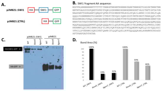 pYX142-mtGFP [60] was used as a backbone for the construction of pJMB21. To monitor expression on both the N- and C-terminal ends, a HA-tag flanked by two new multiple cloning sites (MCS) were introduced into pYX142-mtGFP (Figure S1). This new construct allowed for the expression of proteins containing an N-terminal HA-tag with a C-terminal GFP fusion. Gene synthesis and plasmid construction were sourced through GenScript (Order 702065-3). The N-terminal end of SWI1 (residues 1-556) was synthesized (GenScript) and inserted into pJMB21 between the SbfI and AscI restriction sites to give plasmid pJMB21::SWI1.