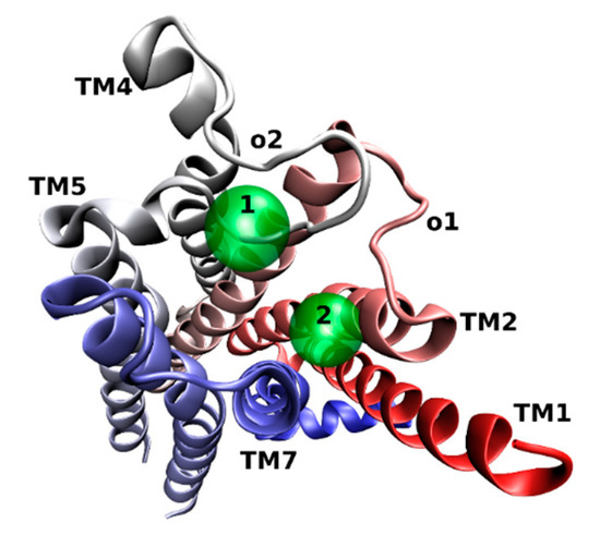 The binding site of classical allosteric modulators like gallamine, alcuronium, or alkane-bis-ammonium compounds has been located between the second (o2) and third extracellular (o3) loops (Figure 2, green) [24,25,26]. The charged EDGE motif in the o2 loop plays a critical role in the binding of these ligands [27]. In the crystal structure of the M2 receptor [4], the allosteric modulator LY2119620 (that binds to the same site between o2 and o3) does not form a hydrogen bond to E172 or E175 of the EDGE motif but makes π–π interactions to the adjacent Y177 in the o2 and Y426 in the extracellular edge of TM7.