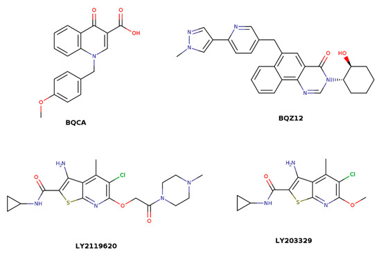 Structures of M1-selective benzyl quinolone carboxylic acid (BQCA), BQZ12, M2-selective LY2119620, and M4-selective LY2033298 allosteric modulator.