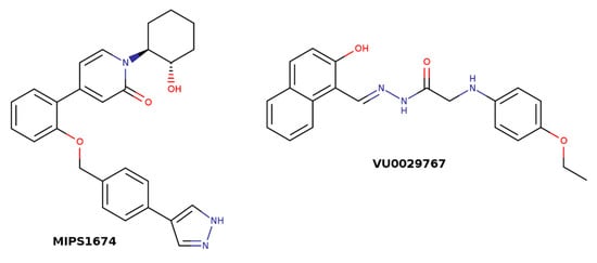 Many GPCRs, including muscarinic receptors, activate several signaling pathways upon activation by agonists [47,48,49]. It is generally accepted that structurally different agonists induce specific changes in the conformation of GPCRs that can lead to non-uniform modulation of signaling pathways. This preferential orientation of the signaling of a GPCR towards a subset of its signal transducers is termed signaling bias [50]. In principle, the structure of the receptor in a ternary complex with agonist and the allosteric modulator is distinct from the one in a binary complex with agonist only and may result in biased signaling too. Attaining signaling bias via allosteric modulation could bring a new plethora of possibilities to modulate receptor function. It has been shown at M1 receptors that the allosteric modulator VU0029767 (Figure 5) acts as a strong PAM of acetylcholine-induced intracellular calcium mobilization while its effects on acetylcholine-induced activation of phospholipase D were marginal [51]. Based on this observation, it has been suggested that differential modulation of receptor coupling to downstream signaling pathways by allosteric modulators may result in signaling bias. However, structurally divergent M1 PAMs BQCA (Figure 4) and MIPS1674 (Figure 5) have shown only small differences in the modulation of the inositol phosphate, β-arrestin, and ERK1/2 pathways [52]. Residues near the common allosteric binding site have been implicated in mediating biased signaling even of orthosteric ligands at several GPCRs [53]. Thus, divergent mechanisms of shrinkage of the vestibule to the binding pocket may not only stand behind subtype-selective effects of allosteric modulators but also drive ligand bias that is common to the entire A class of GPCRs [54].