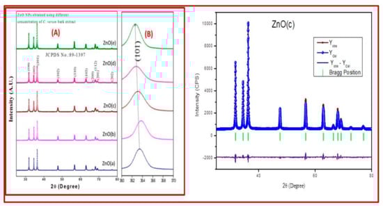 PXRD patterns of ZnO-NPs (A) and shift in the (101) plane obtained using various concentrationsof C. verum plant extract (B); Rietveld refined fitment showed for the ZnO(c) (C).