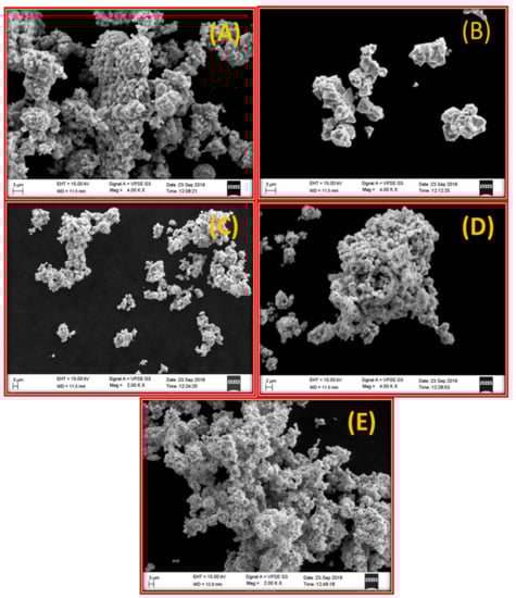 SEM micrograph ofZnO-NPs obtained using various concentration of C. verumplant extract (A) ZnO(a); (B) ZnO(b); (C) ZnO(c); (D) ZnO(d); (E) ZnO(e).
