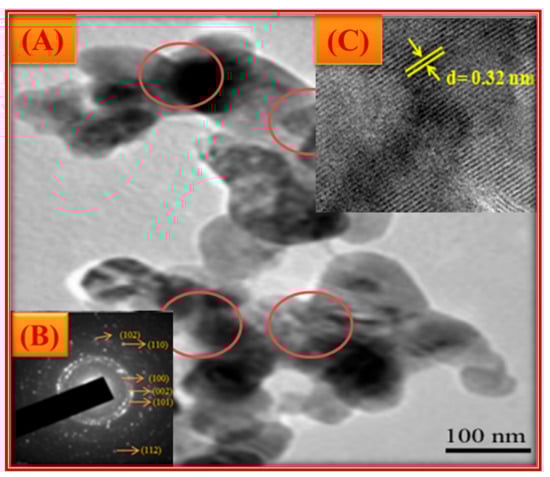 TEM image of ZnO(c) (A); SAED pattern of ZnO NPs (B); High-resolution transmission electron microscopy (HRTEM) with d-spacing (C).