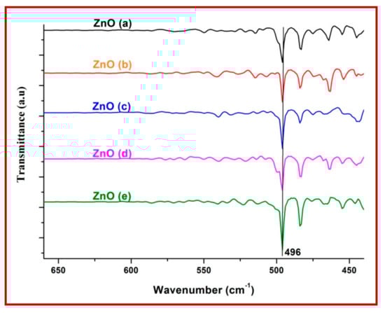 FT-IR Spectra of ZnO-NPs prepared using different concentrations of C. verum extract.