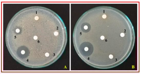 Antibacterial activity of ZnO-NPs green synthesized using C. verum hexane extract. (A): E. coli; (B): S. aureus; 1: C. verum hexane extract; 2: Hexane; 3: Hexane + zinc nitrate hexahydrate; 4: Streptomycin; 5: ZnO-NPs; 6: Sterile distilled water.