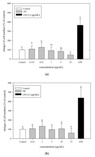 To achieve optimal concentrations for use, the possible cytotoxicity of AG or ER SDEO to murine splenocytes was assessed, respectively. The results showed that there are significant (p < 0.05) cytotoxic effects on splenocytes at the higher concentrations of these two selected SDEO (Figure 1). Based on changes in cell viabilities, the optimal non-cytotoxic concentrations of AG and ER SDEO were 0.125–5 μg/mL and 0.25–25 μg/mL, respectively (Figure 1). In comparison, ER SDEO had less cytotoxicity than that of AG SDEO. The stronger cytotoxic effects of AG SDEO result possibly from its sesquiterpene composition such as the most notable component β-asarone []. To avoid cytotoxic effects on immune cells, non-cytotoxic optimal concentrations of these two selected SDEOs were adopted for the following immunomodulatory evaluation.