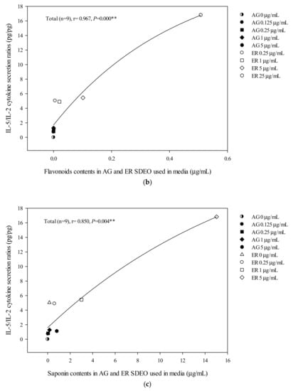 The correlation between total polyphenol (a), flavonoid (b) and saponin (c) contents in AG and ER SDEO used in the media and IL-5/IL-2 cytokine secretion ratios using mouse splenocytes. The correlation was expressed using the Spearman correlation coefficient. The correlation is considered statistically different if p < 0.05. **, p < 0.01.
