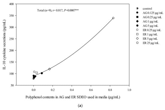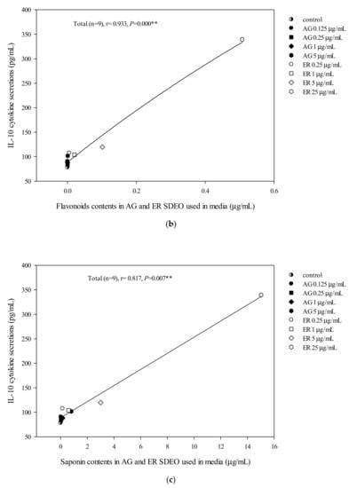 The correlation between total polyphenol (a), flavonoid (b) and saponin (c) contents in AG and ER SDEO used in the media and IL-10 cytokine secretion using mouse macrophages in the absence of LPS. The correlation was expressed using the Spearman correlation coefficient. The correlation is considered statistically different if p < 0.05. **, p < 0.01.
